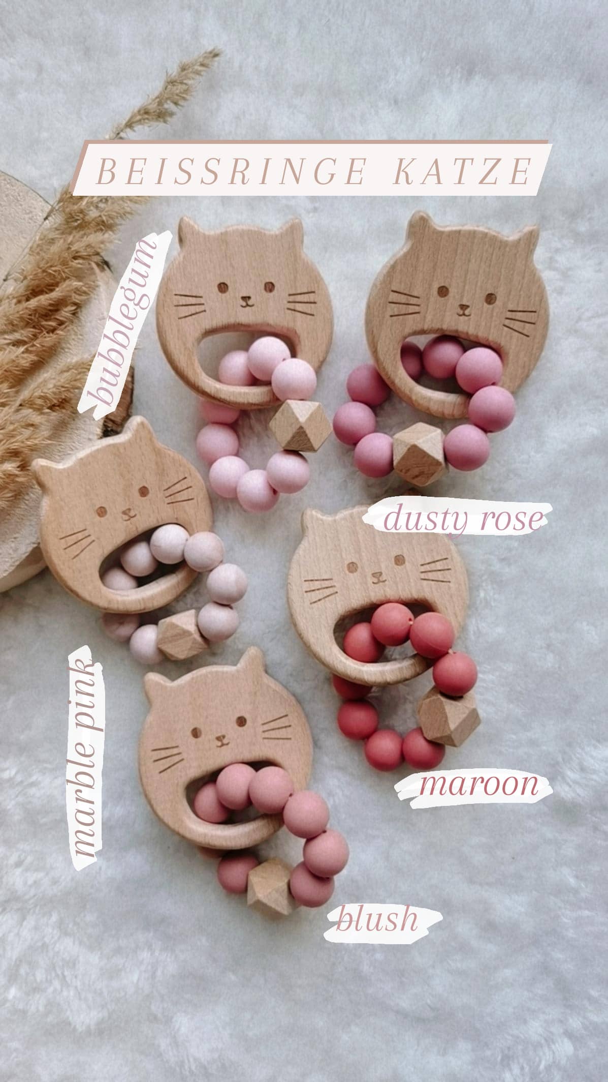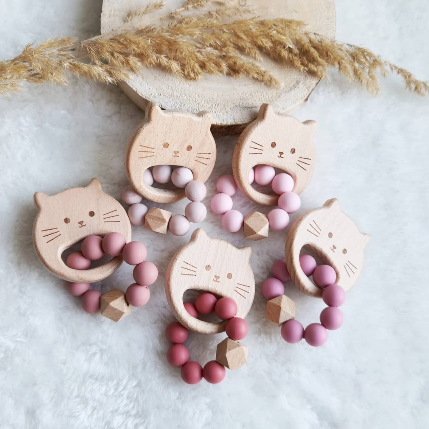 Holzbeißring mit Silikonperlen in verschiedenen Farben.