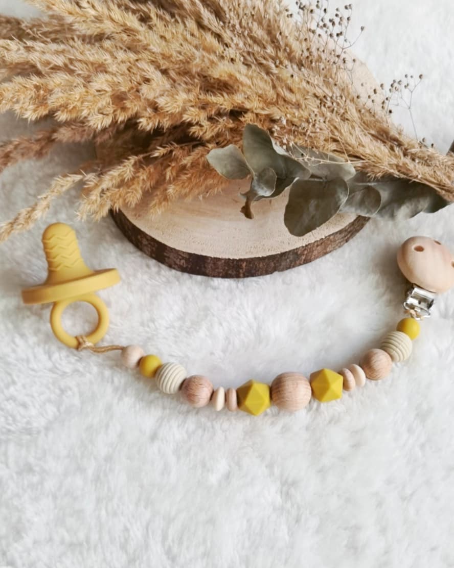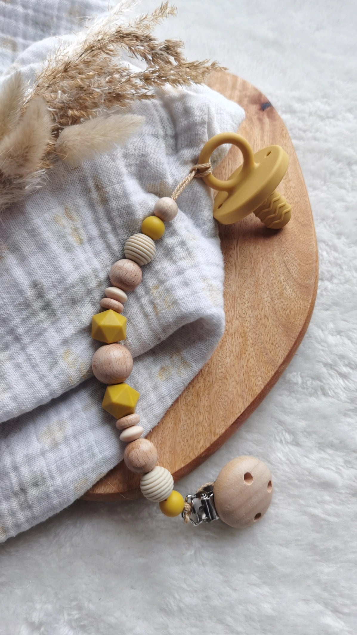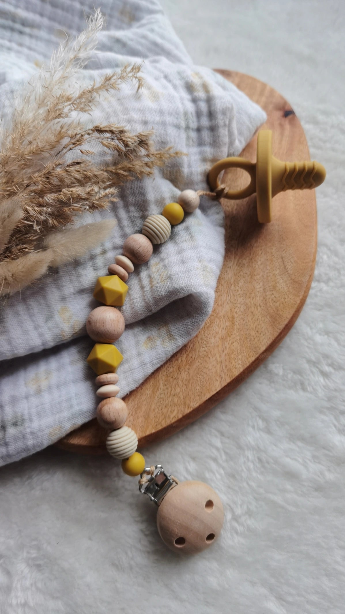 Ihr Kind sollte den Schnullerhalter bzw. die Kette nur unter der Aufsicht von Erwachsenen benutzen.
