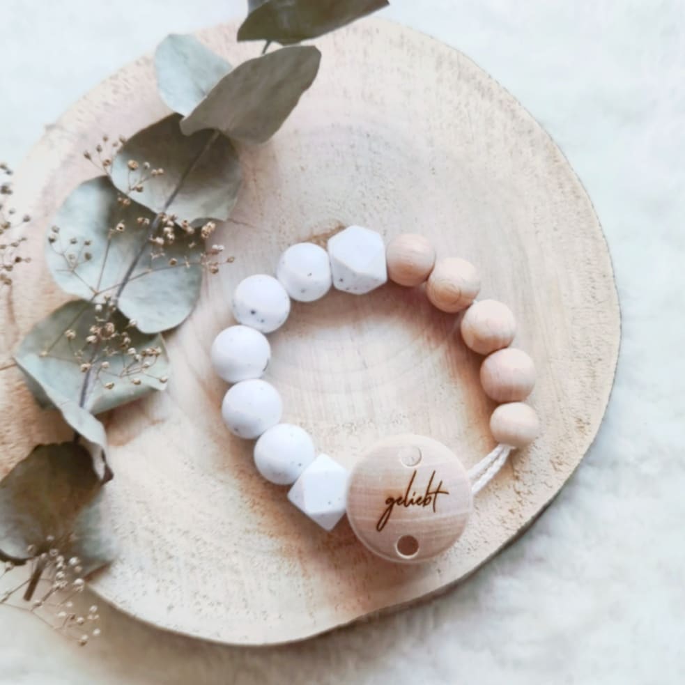 Du kannst die Schnullerkette mit oder ohne Schnulleradapter auswählen, dieser passt zb auf Schnuller von MAM, Bibs (Supreme/Couture) und andere solcher Art. (Ohne den Befestigungsring) Er erleichtert einem das austauschen des Schnullers, und es geht super schnell.
