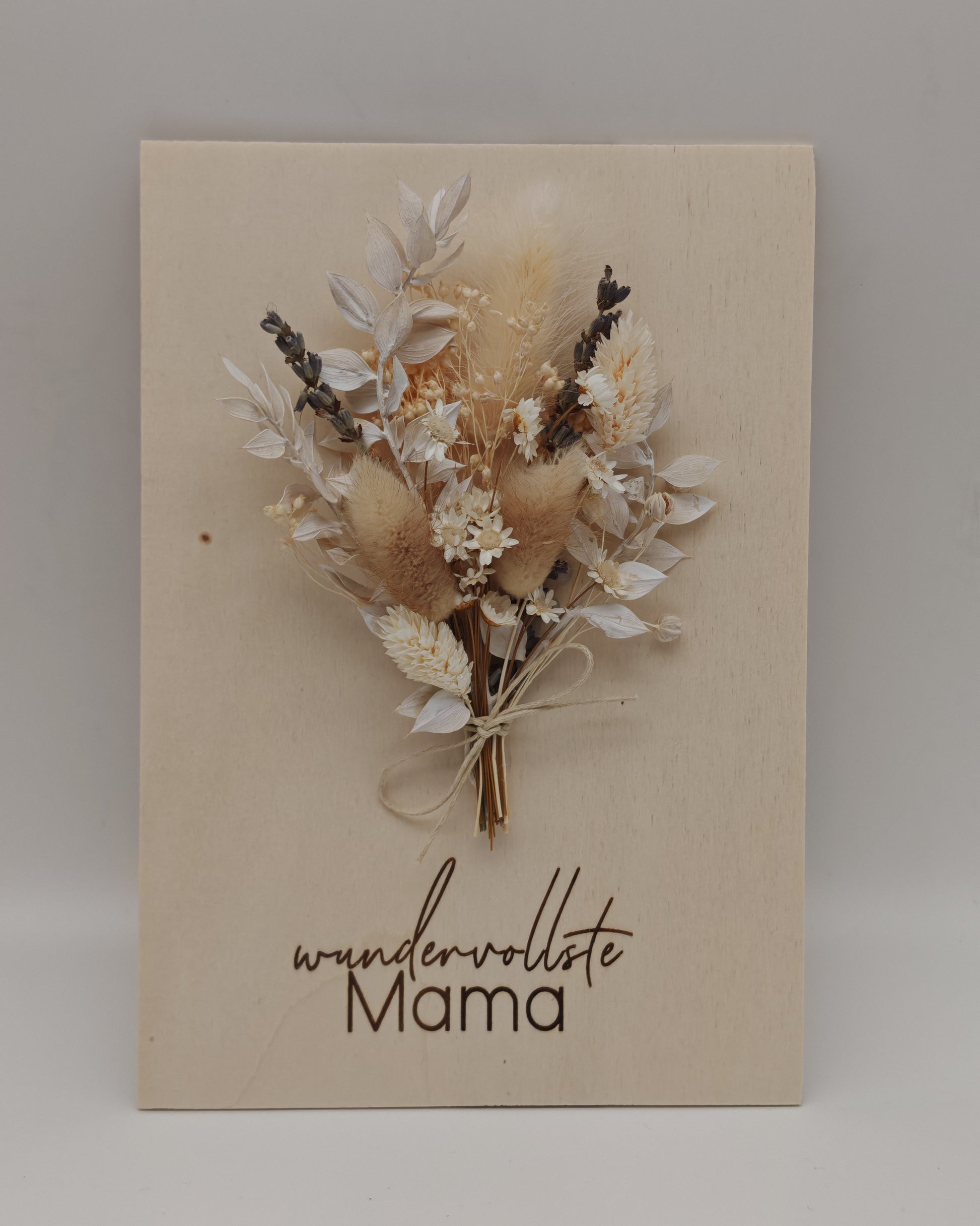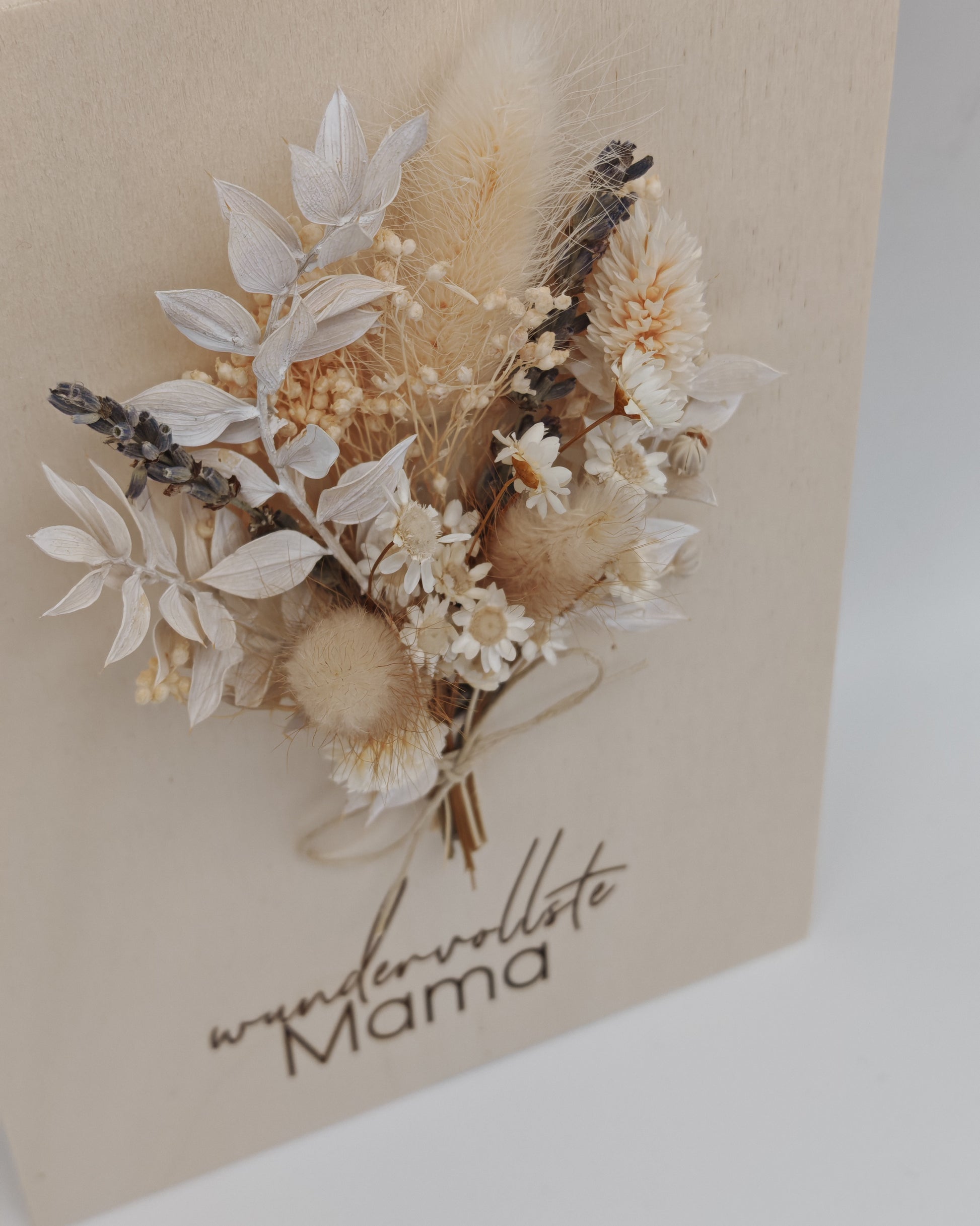 Trockenblumenschild mit der Gravur "wundervollste Mama" und Trockenblumen in lila, weiß und beige tönen.